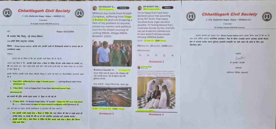 कांग्रेस नेता पूर्व सांसद नवजोत सिंह सिद्धू ने हाल ही में प्रेस कांफ्रेंस कर अपनी पत्नी नवजोत कौर सिद्धू के 4 थे स्टेज के कैंसर से बिलकुल ठीक होने को लेकर एक प्रेस कॉन्फ्रेंस किया था, जिसमें उन्होंने ने दावा किया था कि उनकी पत्नी केवल 40 दिनों में बिना किसी मेडिकल ट्रीटमेंट या दवाई के ठीक हो गईं. सिर्फ अपने खान-पान में कुछ बदलाव करके स्वस्थ हुई है. इस मामले को लेकर छत्तीसगढ़ सिविल सोसाइटी ने अब नवजोत सिंह सिद्धू शो-कॉज नोटिस जारी किया है. 7 दिनों में प्रमाणित डाॅक्यूमेंट नहीं देने पर कानूनी कार्रवाई की चेतावनी दी गई है.