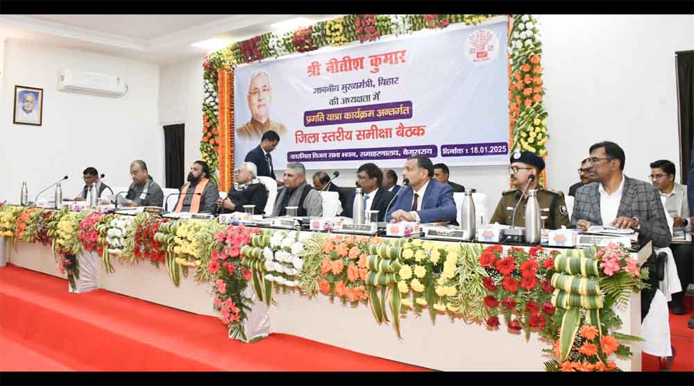 मुख्यमंत्री श्री नीतीश कुमार ने आज प्रगति यात्रा के तीसरे चरण में बेगूसराय जिले में चल रही विकासात्मक योजनाओं के संबंध में समाहरणालय स्थित कारगिल विजय सभा भवन में समीक्षात्मक बैठक की समीक्षात्मक बैठक में बेगूसराय के जिलाधिकारी श्री तुषार सिंगला ने जिले के विकासकार्यों का प्रस्तुतीकरण के माध्यम से विस्तृत जानकारी दी।
