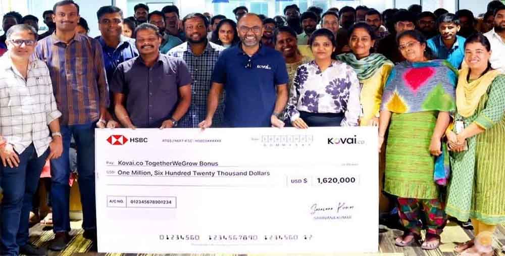तमिलनाडु के कोयंबटूर स्थित एक एआई स्टार्टअप कोवई.को ने अपने कर्मचारियों को 14 करोड़ रुपए का बोनस दिया है, जो किसी भी स्टार्टअप के लिए एक बड़ा सपना होता है। इस कंपनी में कुल 140 कर्मचारी काम करते हैं, और उन्हें यह बोनस उनकी मेहनत और योगदान के लिए दिया गया है। कोवई.को की स्थापना 2011 में सरवणकुमार नामक एक व्यक्ति ने की थी। यह कंपनी बिजनेस-टू-बिजनेस (B2B) सास समाधान (SaaS solutions) प्रदान करती है। सरवणकुमार ने 14 साल बाद अपने कर्मचारियों से किया गया वादा पूरा किया और उन्हें यह बोनस दिया।