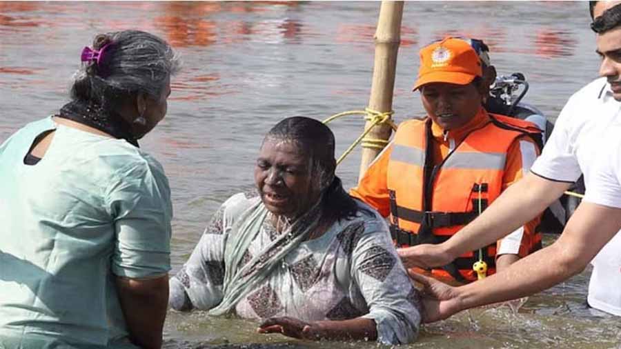 राष्ट्रपति द्रौपदी मुर्मू ने त्रिवेणी संगम में लगाई डुबकी