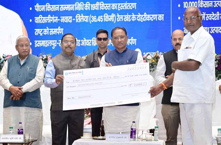 प्रधानमंत्री नरेंद्र मोदी ने आज बिहार के भागलपुर से पीएम किसान सम्मान निधि योजना की 19वीं किस्त जारी की। इसके तहत देश भर के 9.8 करोड़ किसानों के बैंक खातों में 22,000 करोड़ रुपये अंतरित किए गए। इनमें छत्तीसगढ़ के 25 लाख 95 हजार 832 किसान शामिल हैं। इन किसानों खाते में 599 करोड़ 38 लाख रुपए की सम्मान निधि भेजी गई है। मुख्यमंत्री विष्णु देव साय भी पीएम किसान सम्मान निधि कार्यक्रम से जुड़े। उन्होंने राजधानी रायपुर के इंदिरा गांधी कृषि विश्वविद्यालय परिसर में आयोजित कार्यक्रम में किसान सम्मान निधि प्राप्त करने वाले किसानों को बधाई दी और उन्हें सम्मानित भी किया।