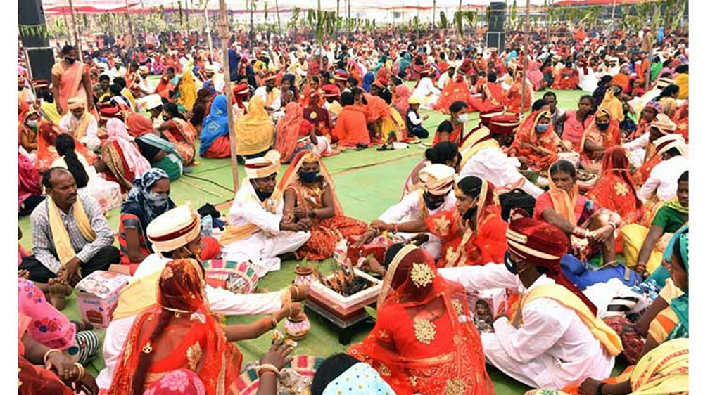मुख्यमंत्री कन्या विवाह योजना अंतर्गत महिला एवं बाल विकास विभाग द्वारा आयोजित सामूहिक विवाह मंगल भवन सहसपुर लोहारा में 15 जोड़े परिणय सूत्र में बंधे लिये सात फेरे