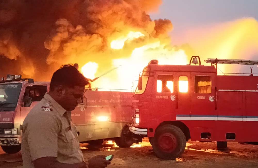 मंदसौर मसाला फैक्ट्री में आग लगने से मचा हड़कंप, कई प्रकार के मसाले होने से आग की लपटों में तेज दुर्गंध भी फैली