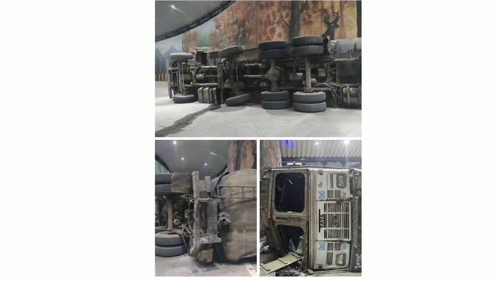 सुपेला के नवनिर्मित रेलवे अंडरब्रिज पर पलटा तेल से भरा ट्रक, चालक घायल
