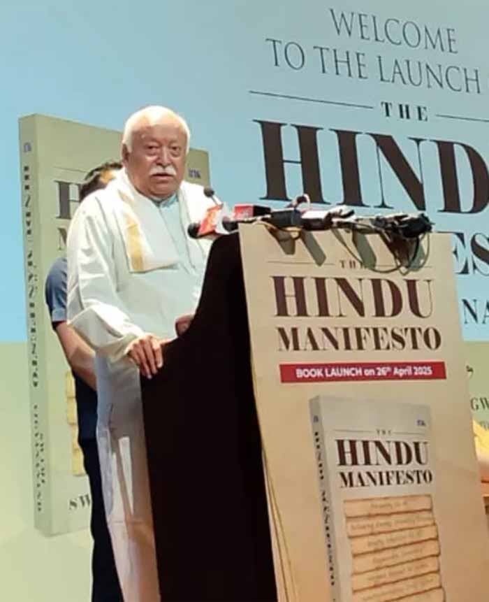 राष्ट्रीय स्वयंसेवक संघ (आरएसएस) के सरसंघचालक मोहन भागवत ने कहा कि भारत की शास्त्रार्थ परंपरा सत्य को सहमति से स्थापित करती है। हिंदू मैनिफेस्टो इसी उद्देश्य से प्रस्तावित है, जो व्यापक चर्चा और सहमति के लिए प्रमाणित पुस्तक है। यह विश्व को नया रास्ता देने का भारत का कर्तव्य है, क्योंकि 2000 वर्षों के आस्तिक, नास्तिक और जड़वादी प्रयोग असफल रहे। भौतिक सुख बढ़ा, लेकिन असमानता और पर्यावरण हानि भी बढ़ी।