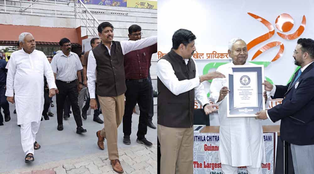 कैनवास पर प्राकृतिक रंगों में सबसे बड़ी मधुबनी पेंटिंग बिहार राज्य खेल प्राधिकरण द्वारा पटना में हासिल की गई। बिहार की समृद्ध सांस्कृतिक विरासत को प्रदर्शित करते हुए, इस उल्लेखनीय उपलब्धि को पहली बार गिनीज वर्ल्ड रिकॉर्ड्स द्वारा आधिकारिक रूप से मान्यता दी गई, जिसने राज्य द्वारा इसे एक और ऐतिहासिक घटना के रूप में चिह्नित किया। प्रमाण पत्र बिहार के माननीय मुख्यमंत्री श्री नीतीश कुमार ने गिनीज वर्ल्ड रिकॉर्ड्स के आधिकारिक निर्णायक श्री ऋषि नाथ से गर्व के साथ प्राप्त किया, जो खेलो इंडिया यूथ गेम्स बिहार 2025 से पहले राज्य के लिए एक और मील का पत्थर है। इस महत्वपूर्ण अवसर पर बिहार के माननीय खेल मंत्री श्री सुरेंद्र मेहता, खेल विभाग के अपर मुख्य सचिव डॉ.बी राजेंदर,निदेशक महेन्द्र कुमार बिहार राज्य खेल प्राधिकरण के महानिदेशक सह सीईओ रवीन्द्रण शंकरण,निदेशक रविंद्र नाथ चौधरी उपस्थित थे।