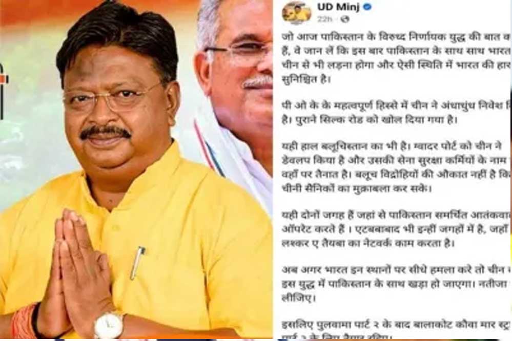 कांग्रेस विधायक यूडी मिंज ने अपने फेसबुक में लिखा है- " जो आज पाकिस्तान के विरुद्ध निर्णायक युद्ध की बात कर रहे हैं वे जान लें कि इस बार पाकिस्तान के साथ-साथ भारत को चीन से भी लड़ना होगा और ऐसी स्थिति में भारत की हार सुनिश्चित है। पीओके के महत्वपूर्ण हिस्से में चीन ने अंधाधुंध निवेश किया है। पुराने सिल्क रोड को खोल दिया गया है। यही हाल बलूचिस्तान का भी है। ग्वादर पोर्ट को चीन ने डेवलप किया है और उसकी सेना सुरक्षाकर्मियों के नाम पर वहां पर तैनात है। बलूच विद्रोहियों की औकात नहीं है कि वे चीनी सैनिकों का मुकाबला कर सके। यही दोनों जगह हैं जहां से पाकिस्तान समर्थित आतंकवादी ऑपरेट करते हैं। एटबबाबाद भी इन्ही जगहों में है, जहां से लश्कर-ए-तैयबा का नेटवर्क काम करता है। अब अगर भारत इन स्थानों पर सीधे हमला करे तो चीन स्वत: इस युद्ध में पाकिस्तान के साथ खड़ा हो जाएगा। नतीजा सोच लीजिए। इसलिए पुलवामा पार्ट-2 के बाद बालाकोट कौवा मार स्ट्राइक पार्ट-2 के लिए तैयार रहिए।"