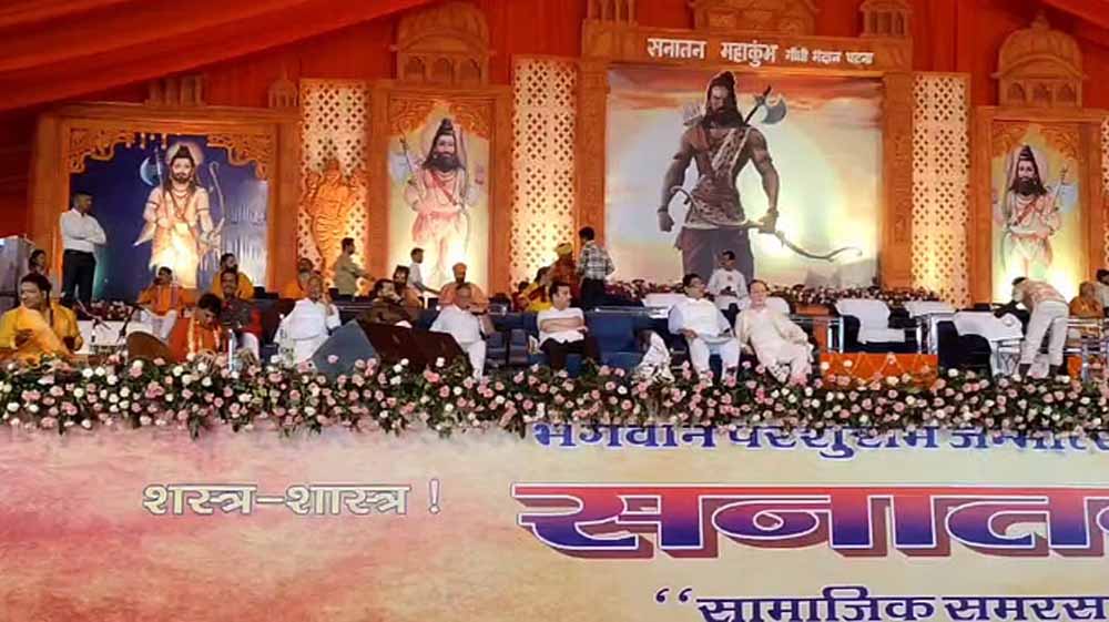 भगवान परशुराम जन्म महोत्सव के समापन अवसर पर आज पटना के गांधी मैदान में पहली बार सनातन महाकुंभ की शुभारंभ हो चुका है। हनुमान चालीसा और परशुराम चालीसा के पाठ से कार्यक्रम की शुरुआत हो चुकी है। राज्यपाल आरिफ मोहम्मद खान और डिप्टी सीएम विजय सिन्हा भी कार्यक्रम में शामिल हुए हैं। बाबा बागेश्वर धाम के पंडित धीरेंद्र शास्त्री भी पहुंच चुके हैं। उन्होंने प्रभु श्रीराम के जयकारे लगाए। अपने संबोधन के दौरान उन्होंने कहा कि भारत हिंदू राष्ट्र होगा तो पहला हिंदू राज्य बिहार होगा, बहुत सारी ताकतें गजवा ए हिंद बनाना चाहती हैं। हमारे धर्म पर घात हुआ तो हमलोग प्रतिघात करेंगे। हमारा सपना भगवा ए हिंद है। हमें मुस्लमानों और ईसाईयों से दिक्कत नहीं। बिहार चुनाव के बाद राज्य में पद यात्रा करूंगा।