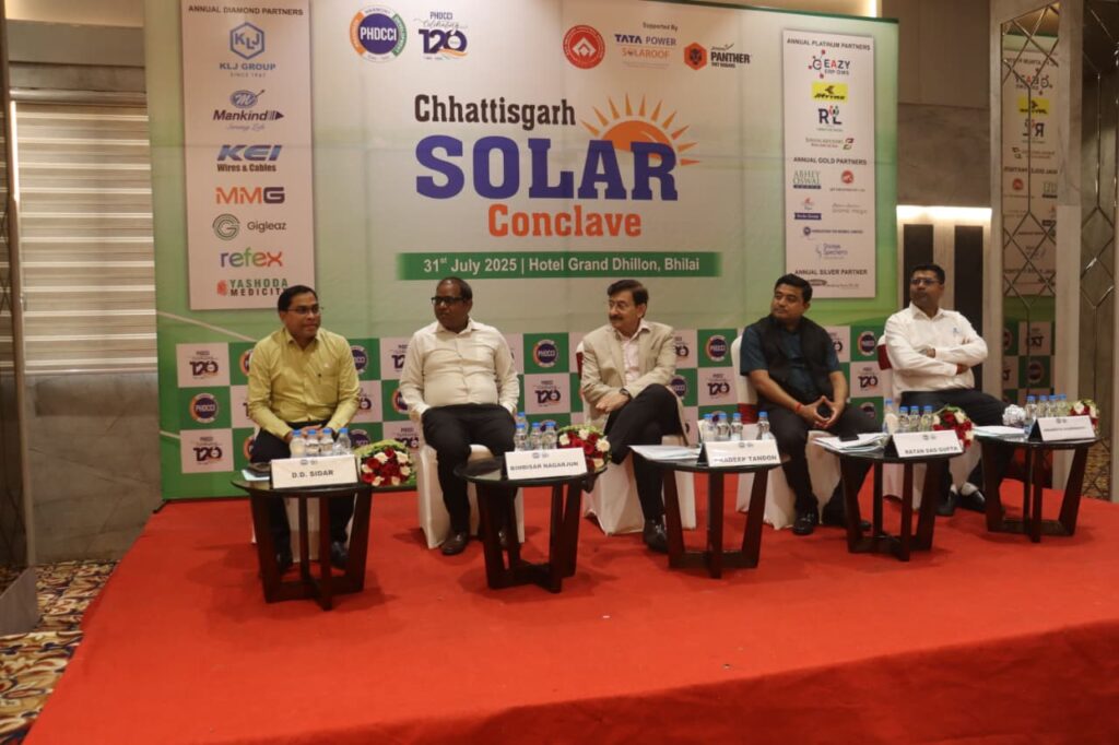 Raipur 01.08.2025 पीएचडी चैंबर ऑफ कॉमर्स एंड इंडस्ट्री (PHDCCI) छत्तीसगढ़ राज्य चैप्टर ने टाटा पावर, जिंदल स्टील लिमिटेड और बीएसपी एंक्सिलरी इंडस्ट्रीज़ एसोसिएशन के सहयोग से छत्तीसगढ़ सोलर कॉन्क्लेव का आयोजन किया। इस कार्यक्रम में अक्षय ऊर्जा क्षेत्र के विभिन्न महत्वपूर्ण व्यक्ति एकत्र हुए।
