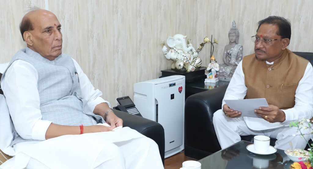 नई दिल्ली, 6 अक्टूबर 2025 – छत्तीसगढ़ के मुख्यमंत्री श्री विष्णुदेव साय ने आज नई दिल्ली में केंद्रीय रक्षा मंत्री श्री राजनाथ सिंह से उनके निवास पर सौजन्य मुलाक़ात की। बैठक में बिलासपुर एयरपोर्ट के विस्तार, रक्षा क्षेत्र के विकास, पूरे प्रदेश में सेना भर्ती रैलियों के आयोजन एवं नौसैनिक पोतों के नामकरण जैसे कई महत्वपूर्ण विषयों पर सार्थक चर्चा हुई। इस अवसर पर केंद्रीय आवासन एवं शहरी कार्य राज्यमंत्री श्री तोखन साहू और मुख्यमंत्री के प्रमुख सचिव श्री सुबोध कुमार सिंह भी उपस्थित थे।
