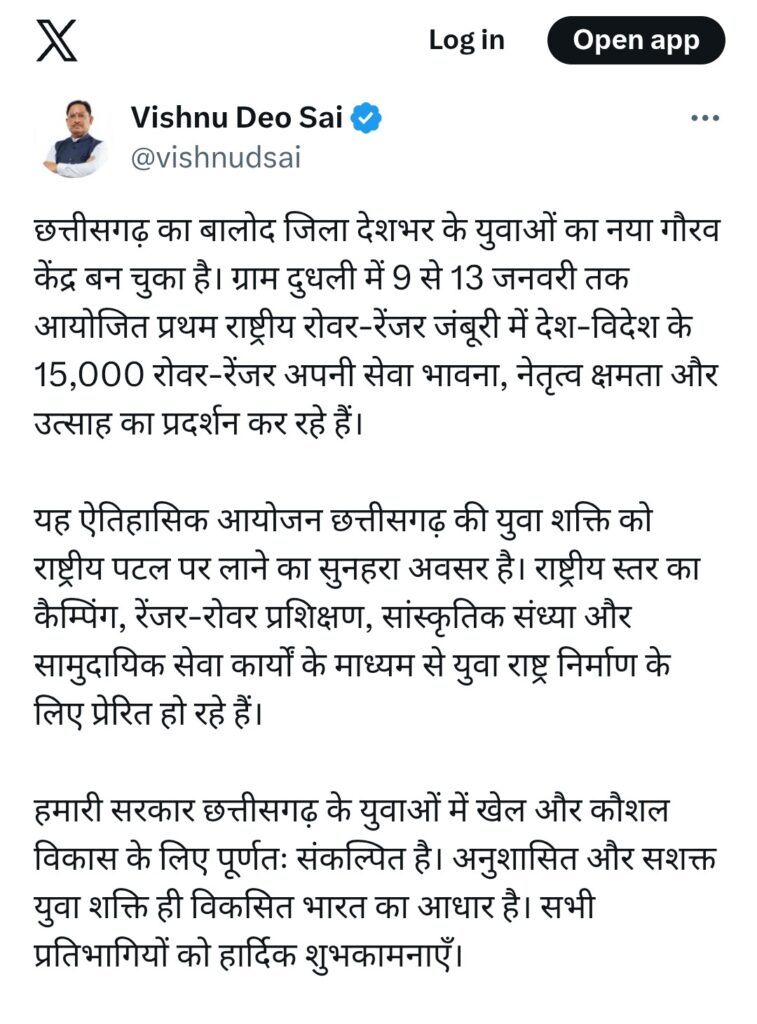 मुख्यमंत्री श्री विष्णुदेव साय ने कहा कि जिला बालोद के ग्राम दुधली में 9 से 13 जनवरी तक आयोजित प्रथम राष्ट्रीय रोवर-रेंजर जंबूरी में देश-विदेश से आए लगभग 15 हजार रोवर-रेंजर अपनी सेवा भावना, नेतृत्व क्षमता और राष्ट्र के प्रति समर्पण का जीवंत प्रदर्शन कर रहे हैं। मुख्यमंत्री श्री विष्णुदेव साय ने कहा कि यह ऐतिहासिक जंबूरी छत्तीसगढ़ की युवा शक्ति को राष्ट्रीय मंच पर लाने का सुनहरा अवसर है। राष्ट्रीय स्तर के कैंपिंग, रोवर-रेंजर प्रशिक्षण, सांस्कृतिक संध्याओं और सामुदायिक सेवा गतिविधियों के माध्यम से युवा प्रतिभागी अनुशासन, सेवा और नेतृत्व के मूल्यों के साथ राष्ट्र निर्माण की भावना को सशक्त कर रहे हैं।