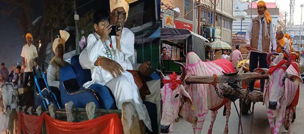 शहर की सड़कों पर बुधवार की शाम कुछ अलग ही था। न डीजे की कानफोड़ू आवाज, न रोशनी की चकाचौंध, न लग्जरी गाड़ियों की कतार। अगर कुछ था तो बैलों की सधी हुई चाल, लकड़ी की बैलगाड़ियों की मद्धिम चरमराहट और लोकगीतों की कोमल तान। यह नजारा देख हर राहगीर ठिठक गया, मोबाइल कैमरे निकल आए और एक ही सवाल गूंजने लगा, अब भला बैलगाड़ी से भी कोई बरात जाता है?
