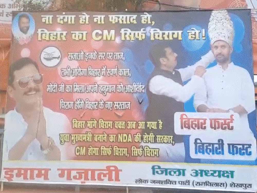 पोस्टरों में चिराग पासवान के सिर पर ताज पहने दिखाया गया था और उन पर नारे छपे थे कि उन्हें ताज पहनाओ, तभी बिहार का स्वर्ण युग आएगा। मोदी ने उन्हें आशीर्वाद दिया है। चिराग बिहार के नए नेता बनेंगे और बिहार को चिराग की ज़रूरत है। अब समय आ गया है कि एक युवा मुख्यमंत्री नियुक्त किया जाए। राष्ट्रीय लोकतांत्रिक गठबंधन सरकार बनाएगा और चिराग मुख्यमंत्री बनेंगे।