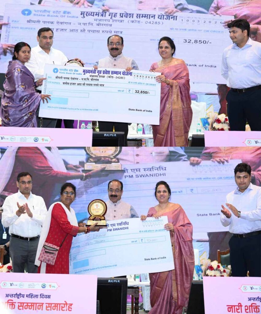 उप मुख्यमंत्री साव ने निर्धारित समयावधि में प्रधानमंत्री आवास का निर्माण पूर्ण कर मुख्यमंत्री गृहप्रवेश सम्मान का हकदार बनीं रायपुर की रजनी ध्रुव, कुम्हारी की गीता पाल और बीरगांव की पलक देवांगन को (प्रत्येक को) 32 हजार 850 रुपए का चेक प्रदान किया। उन्होंने प्रधानमंत्री स्वनिधि योजना के अंतर्गत रायपुर नगर निगम की तीन स्ट्रीट वेंडर्स लक्ष्मी साहू, रत्ना दीप और बी. लावण्या को 50-50 हजार रुपए के चेक सौंपे।
