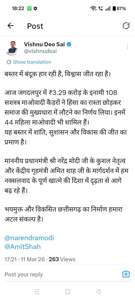 रायपुर 11 मार्च 2026/मुख्यमंत्री श्री विष्णु देव साय ने बस्तर क्षेत्र में माओवादी हिंसा के खिलाफ चल रही मुहिम को एक बड़ी सफलता बताते हुए कहा है कि अब बस्तर में बंदूक नहीं, बल्कि विश्वास की जीत हो रही है। उन्होंने कहा कि जगदलपुर में ₹3.29 करोड़ के इनामी 108 सशस्त्र माओवादी कैडरों द्वारा हिंसा का रास्ता छोड़कर समाज की मुख्यधारा में लौटने का निर्णय इस बात का स्पष्ट संकेत है कि बस्तर में शांति, सुशासन और विकास की दिशा में सकारात्मक परिवर्तन हो रहा है।