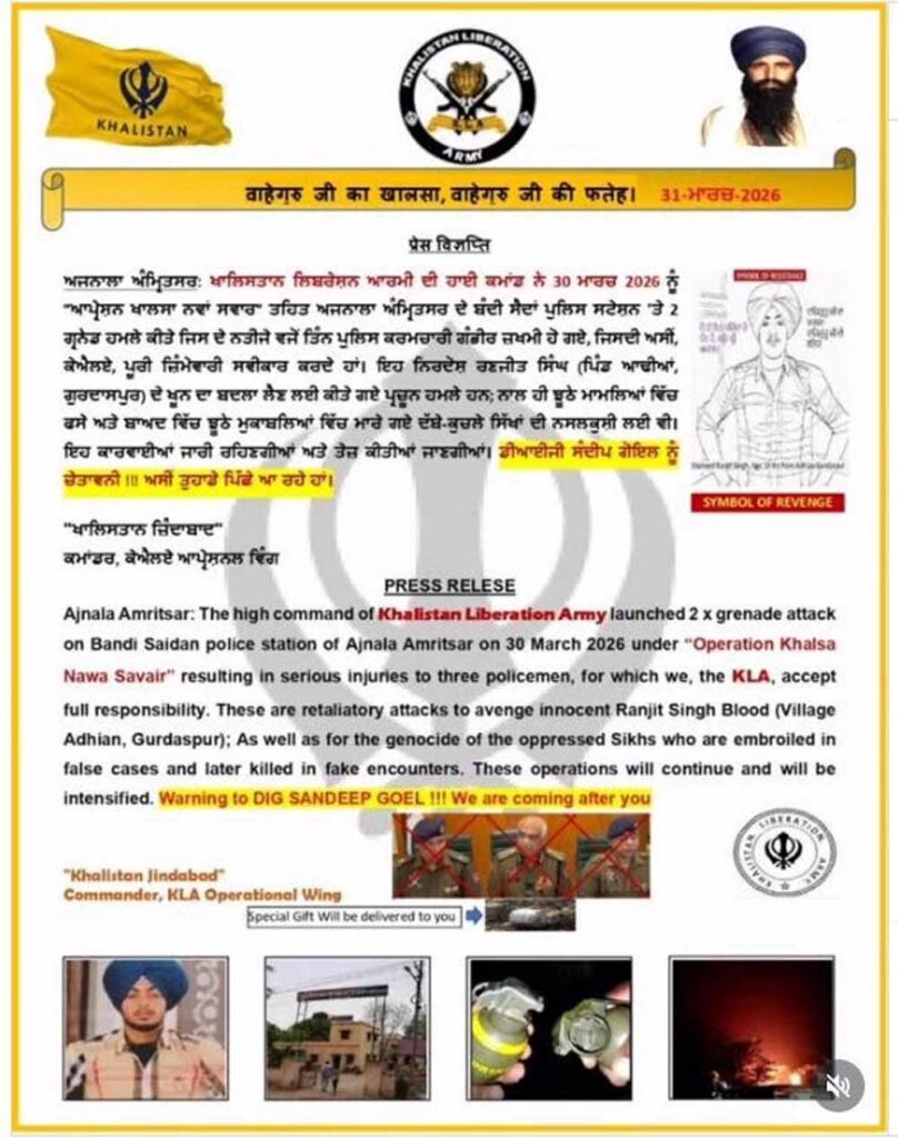 वायरल पोस्ट में खालिस्तान लिबरेशन आर्मी द्वारा इसकी जिम्मेदारी ली गई है पर इसे लेकर अभी तक कोई आधिकारिक पुष्टि नहीं हुई है। वायरल पोस्ट में लिखा गया है कि अमृतसर खालिस्तान लिबरेशन आर्मी के हाई कमांड ने 30 मार्च 2026 को ऑपरेशन खालसा नया सवेरा के तहत अजनाला, अमृतसर के भिंडीसैदां पुलिस स्टेशन पर 2 ग्रेनेड हमले किए, जिससे तीन पुलिसवाले गंभीर रूप से घायल हो गए। इसकी जिम्मेदारी हम, KLA, स्वीकार करते हैं।